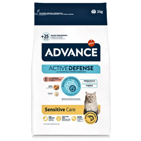 ADVANCE Sensitive Care Salmon – מזון סופר פרימיום לחתולים רגישים פורמולה ייעודית מסדרת ADVANCE Active Defense, המותאמת במיוחד לחתולים בוגרים בעלי רגישות תזונתית או עיכול רגיש. מבוססת על סלמון כמקור חלבון יחיד מן החי, בשילוב אורז קל לעיכול, לתמיכה בעיכול תקין, בריאות העור והפרווה וחיזוק המערכת החיסונית.