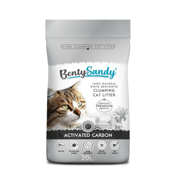 BentySandy Active Carbon Cat Litter חול חתולים עם פחם פעיל לספיגה מקסימלית מבית BentySandy. עשוי מ־100% בנטוניט לבן טבעי בתוספת פחם פעיל לנטרול ריחות עוצמתי. מספק התגבשות חזקה, ספיגה מצוינת וניקיון ממושך גם בבתים עם מספר חתולים.